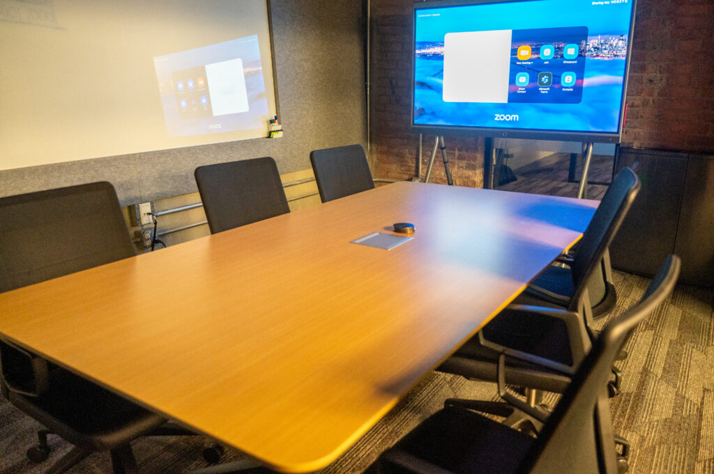 Features: 65-inch TV screen, wireless microphones, wifi internet, glassboard, seamless Zoom and Teams hookup