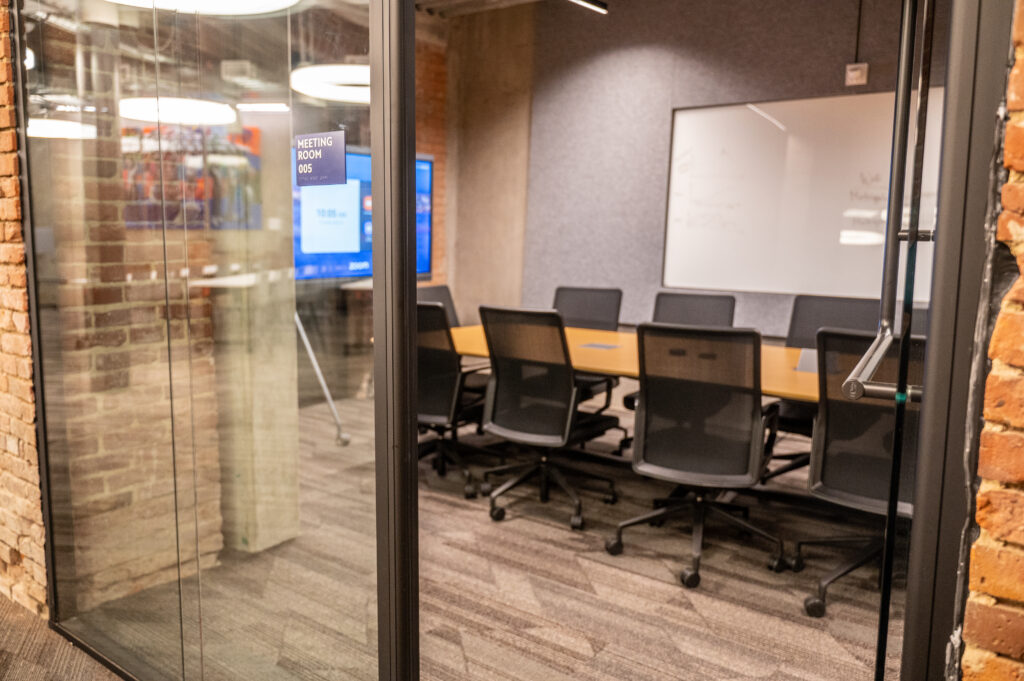 The spacious Equity Exchange room contains a striking conference table made from original salvaged wood, serving as a place to come together. It is enclosed for sound privacy and has an adjoining meeting room which can be rented for greater capacity.